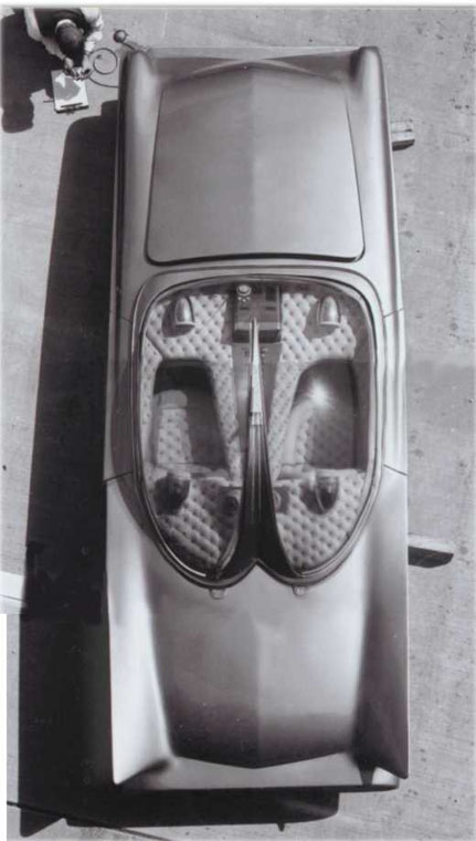 But perhaps the most striking feature of the car was its bubble top. Blown from clear Lucite, it echoed the clear canopies on numerous show cars that Ford and General Motors had built in the Fifties, commencing with the ’54 GM Motorama cars and Ford’s Lincoln Futura. “Freeblown” without a female fixture to define its shape, the bubble top was attached to a mounting ring with small screws which, in turn, was attached to two hinges bolted to the body. To trim the mating interface between the ring and the top, Starbird used a white filler cord carefully pressed into the gap between the bubble top and the mounting ring. Starbird fit a windsplit to the bubble top which curved inward to the curve of the top, and featured twin antennas at the horizontal, leading edge.